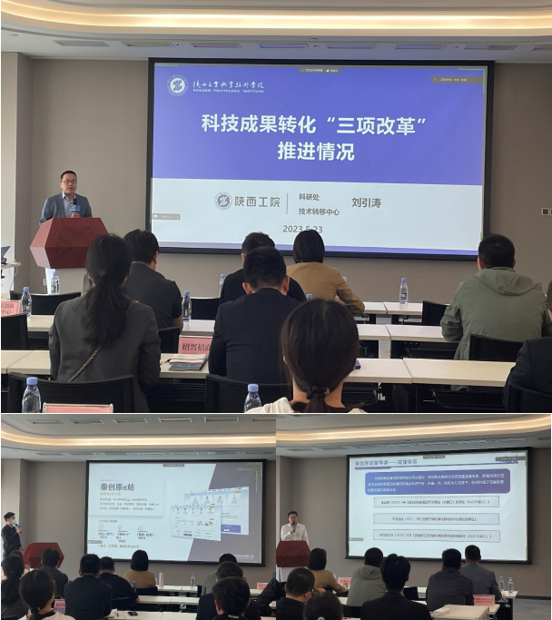 活动现场,首先由我校科研处处长、技术转移中心主任刘引涛介绍陕西工业职业技术学院科技成果转化“三项改革”推进情况;其次,秦创原创新促进中心代表为与会人员讲解了秦创原总窗口项目落地相关政策;秦创原发展股份有限公司代表介绍了公司为科研团队提供的相关服务。