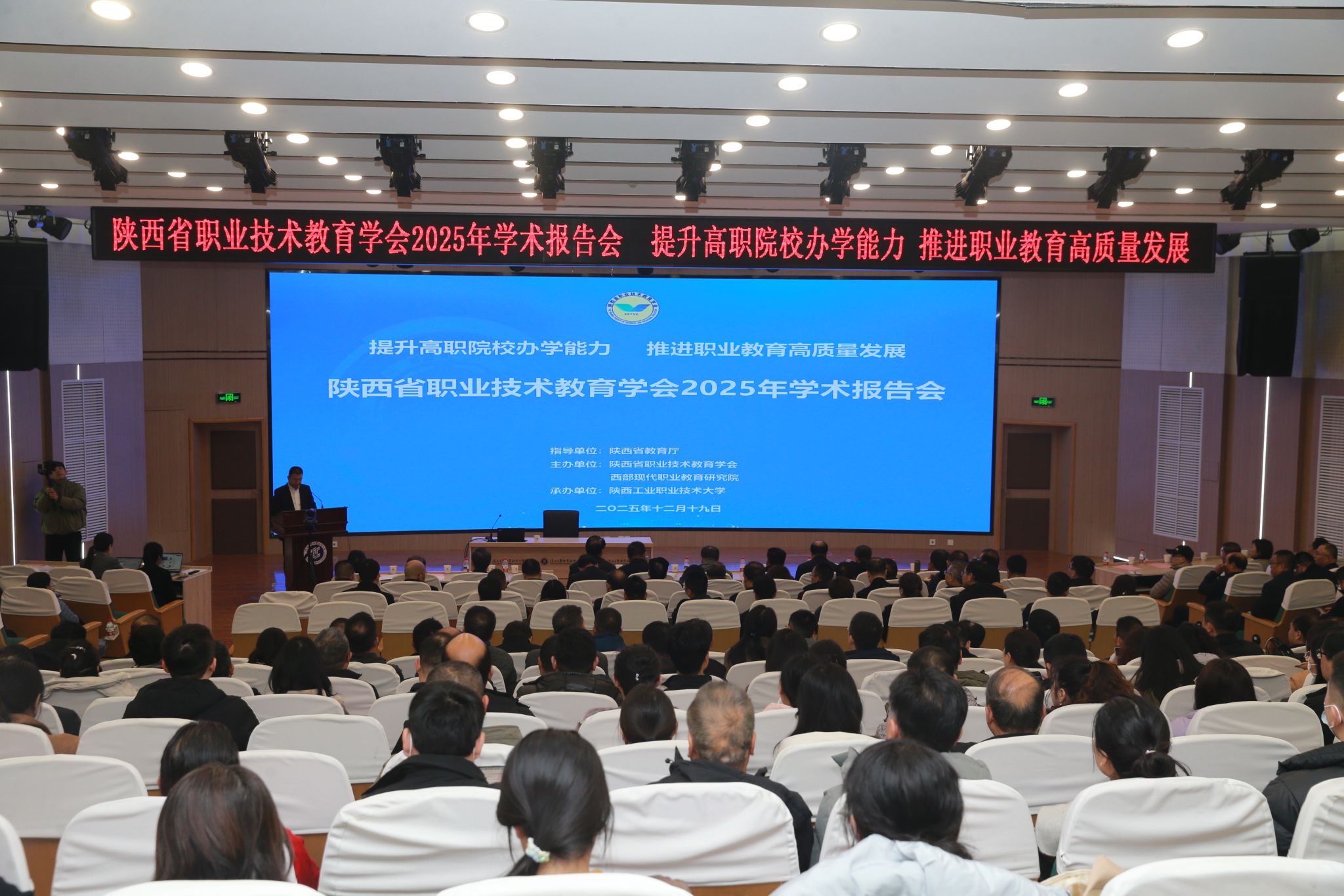 12月19日,陕西省职业技术教育学会2025年学术报告会在我校渭城校区学术会堂召开。会议以“提升高职院校办学能力 推进职业教育高质量发展”为主题,旨在为陕西职业教育破解难题、实现高质量发展提供思想指引与实践辅导。