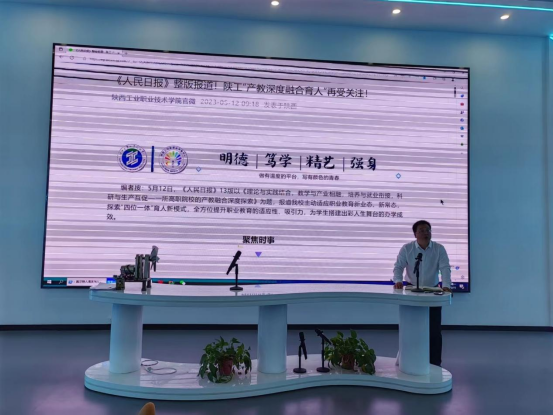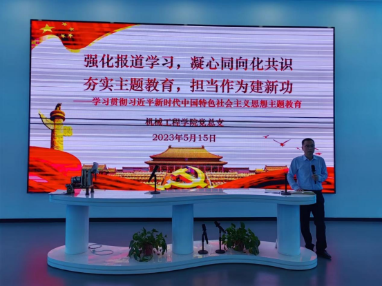根据学校关于印发《中共陕西工业职业技术学院委员会深入开展学习贯彻习近平新时代中国特色社会主义思想主题教育的实施方案》的通知要求,以及结合5月12日《人民日报》整版报道陕西工业职业技术学院《理论与实践结合,教学与产业相融,培养与就业衔接,科研与生产互促—一所高职院校的产教融合深度探索》文章学习与宣传,5月15日下午,机械工程学院党总支在机加工实训中心展厅举行了题为“强化报道学习,凝心同向化共识;夯实主题教育,担当作为建新功”主题党课,机械学院全体教师参会,会议由机械工程学院党总支书记苏宏志主持。