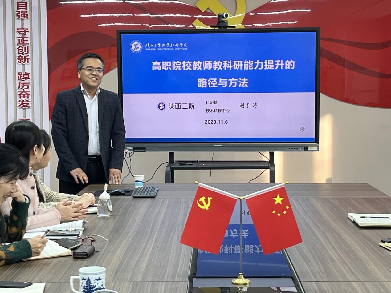 会上,刘引涛处长作了题为《高职院校教师科研能力提升的路径与方法》的专题报告,解读了《陕西工业职业技术学院横向科研项目及经费管理办法》《陕西工业职业技术学院科技成果转化管理实施办法(修订)》《陕西工业职业技术学院知识产权(专利)管理办法》等相关文件,重点对科研管理工作、课题申报注意事项、经费报销制度、科研平台搭建、考核及奖励等相关内容进行了深入解读,进一步加深了全体教职工对相关科研政策的了解。白国政院长随后进行了科研动员,鼓励学院教师,特别是博士、青年教师要积极树立科研意识、参与科研活动,不断提升个人水平与素质,以科研促进教学。
