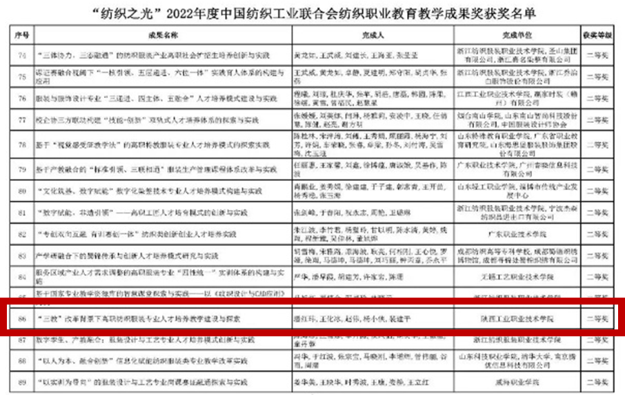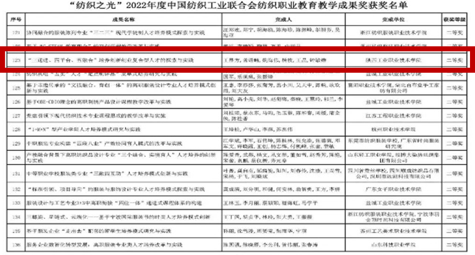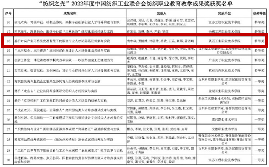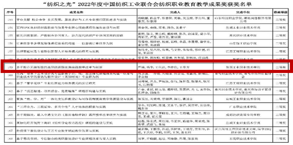 金秋飘桂香,双节人团圆。恰逢教师节和中秋节,中国纺织工业联合会公布了关于“纺织之光”2022年度中国纺织工业联合会纺织教育教学成果奖的评审结果。经过初评、网络评审和会议评审等环节,我校纺织服装教师团队共荣获特等奖1项,二等奖4项的优异成绩。其中,袁丰华主持申报的《基于时尚产业可持续发展背景下的服装专业人才培养路径探索实践》获特等奖; 潘红玮主持申报的《“三教”改革背景下纺织服装专业高职人才培养教学建设与探索》,王显方主持申报的《“三递进、四平台、五融合”培养创新创业复合型人才的探索与实践》,严瑛主持申报的《基于校企无缝衔接的高职纺织服装类实践教学改革与创新》以及徐明亮主持申报的《基于“三教”改革的高职纺织服装专业群创新创业教育课堂革命的研究与实践》均获得二等奖。