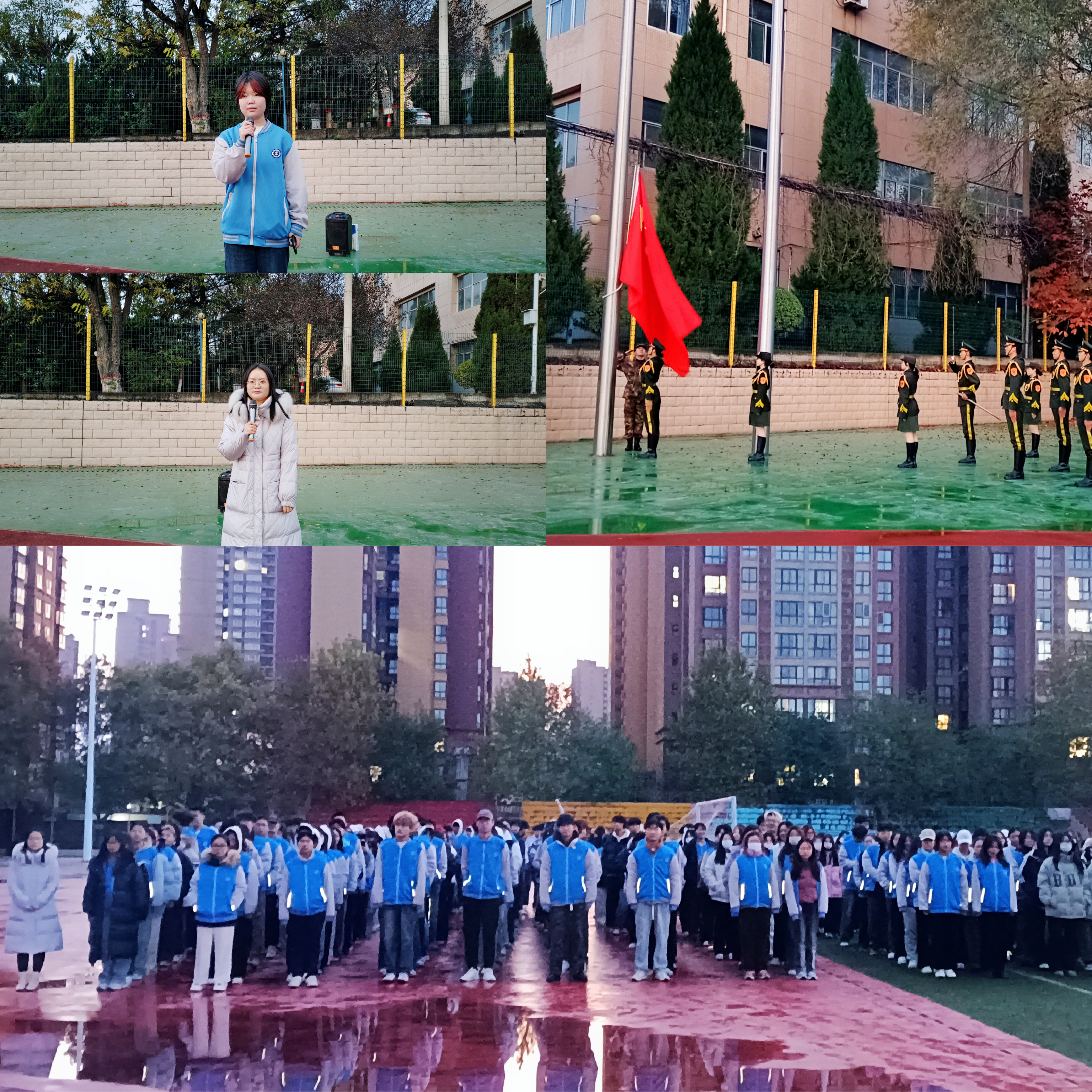 6点50分,升旗仪式正式开始。伴随着慷慨激昂的国歌,学校国旗护卫队队员迈着庄严整齐的步伐,护送鲜艳的五星红旗缓缓走来,全体师生肃穆行注目礼,五星红旗迎风飘扬,嘹亮的国歌在操场上回响。