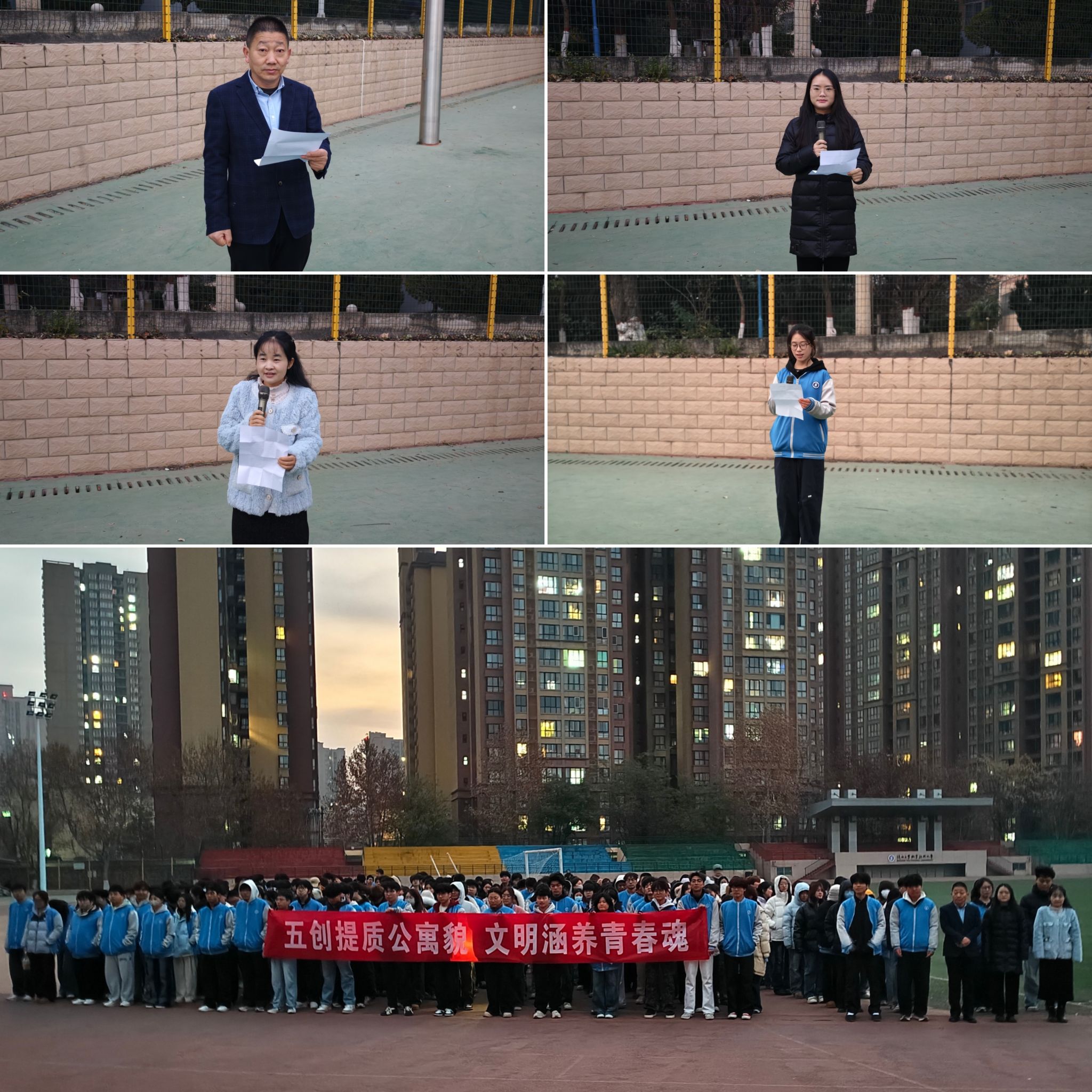 为持续深化“一站式”学生社区“美丽公寓”创建成效,将文明素养培育融入日常教育,引导学生以实际行动践行“五创”理念,12月8日清晨,化工与纺织服装学院在渭城校区田径场举行“五创提质公寓貌 文明涵养青春魂”国旗下主题教育活动。学院党总支书记杨修国、学工办主任曹淼、辅导员闫琼及全体学生齐聚国旗之下,共赴文明之约,共话成长之道。