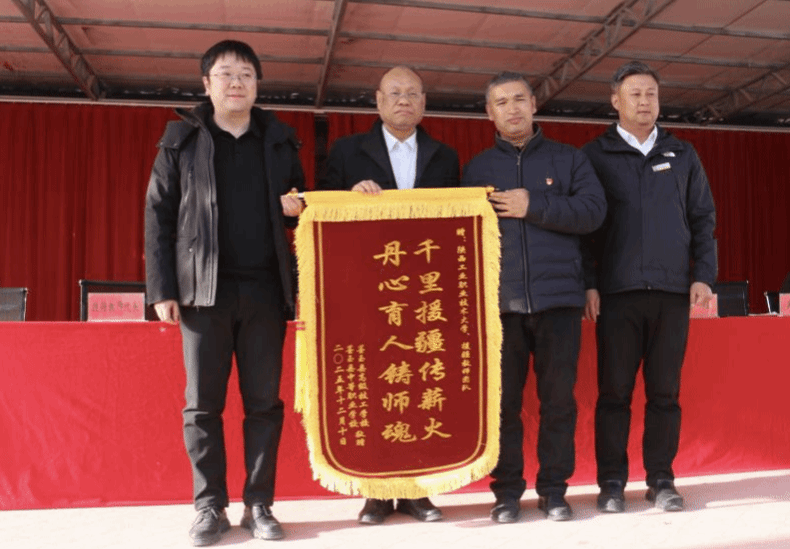 墨玉县高级技工学校向我校援疆团队赠送“千里援疆传薪火,丹心育人铸师魂”锦旗。这面锦旗既是对援疆教师无私奉献精神的生动写照,更是两地教育深厚情谊的有力见证。为表彰援疆教师的突出贡献,墨玉县高级技工学校授予我校全体援疆教师“最美教师”荣誉称号,授予李海平、杨阳、范夕萌、程兴旺、卓永斌等老师“优秀教师”荣誉称号。我校副校长刘清为李海平、杨阳、范夕萌、程兴旺四位教师颁发“2025年援疆特殊贡献奖”,并鼓励全体援疆教师将这份援疆精神带回校园,持续传递教育正能量。