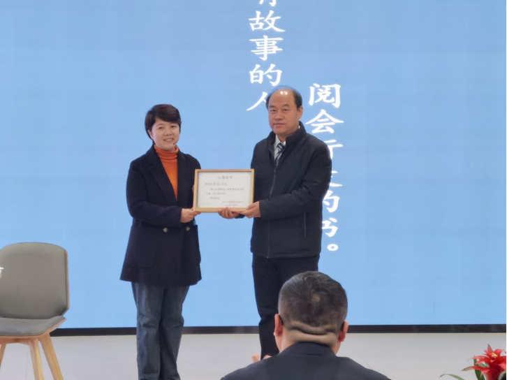 副校长梅创社为董娟老师颁发了“工圕·真人图书馆”入选证书。图书馆会将每次的交流内容、视频及学生反馈等整理成“真人图书”,作为我校图书馆的特色馆藏。